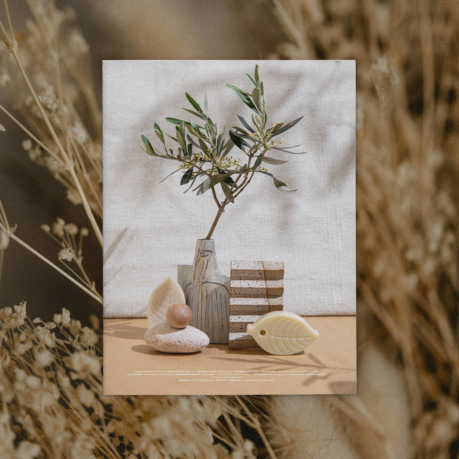 Le design mêle authenticité et modernité : une mise en page épurée, des tons naturels, des textures évoquant la matière brute et des images lumineuses qui mettent en avant la simplicité du geste et la beauté du lien familial.