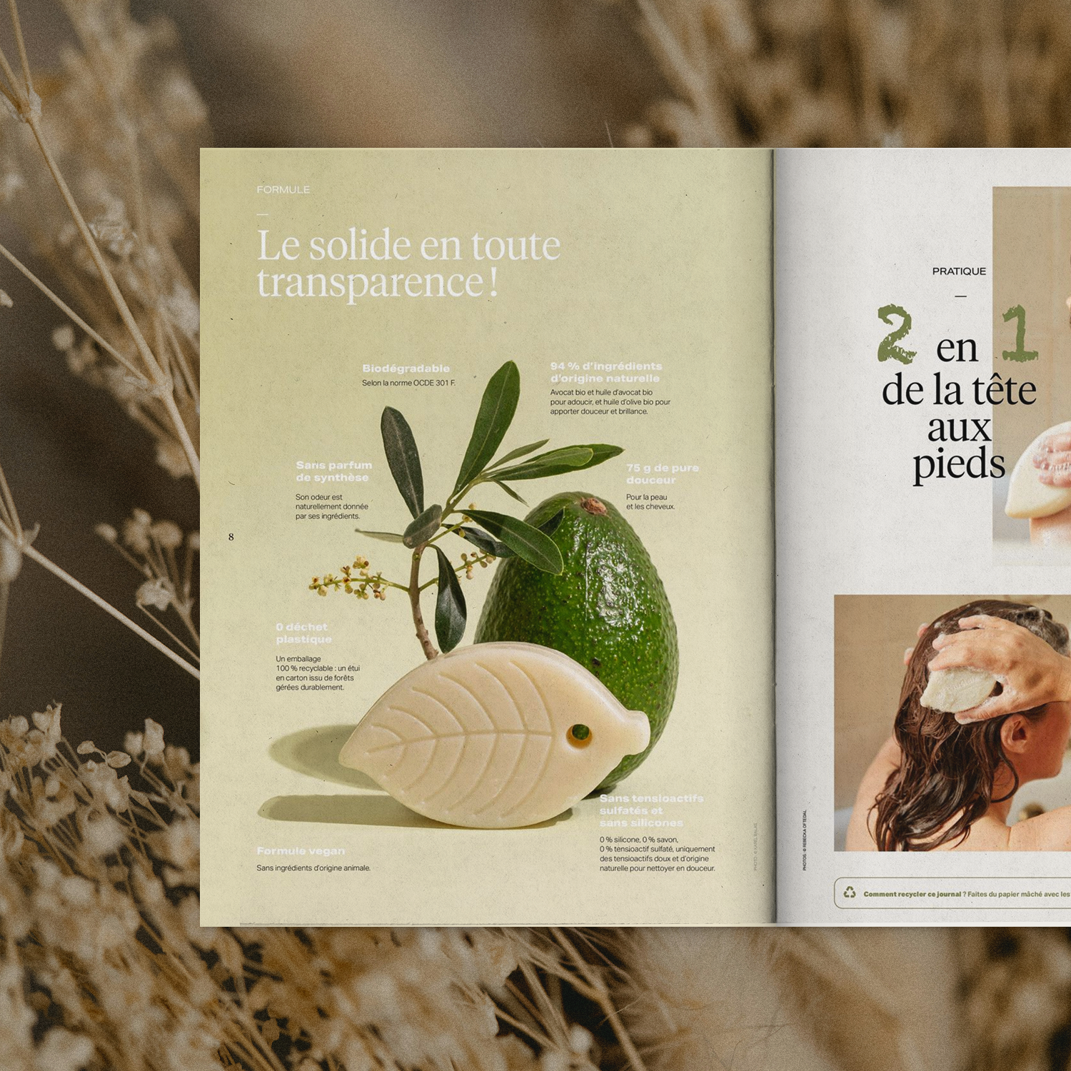 J’ai imaginé la ligne artistique et supervisé la création graphique du journal, en veillant à traduire visuellement les valeurs d’engagement, de douceur et de naturalité portées par la marque. Solide invite les familles à repenser leurs gestes du quotidien, à travers un contenu à la fois inspirant, accessible et esthétique.